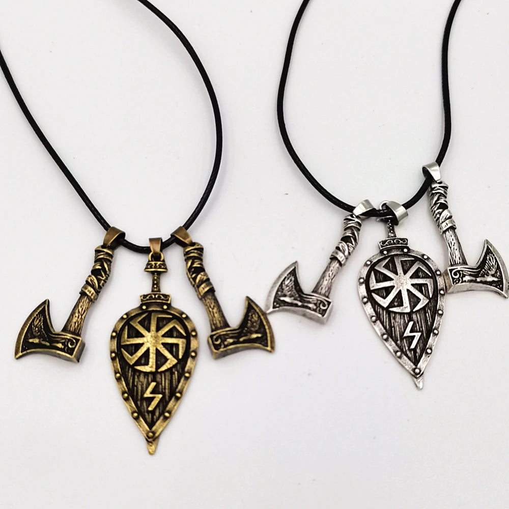 Viking Shield Rune Pendant Necklace with Sword, Axe, and Slavic Amulet Design