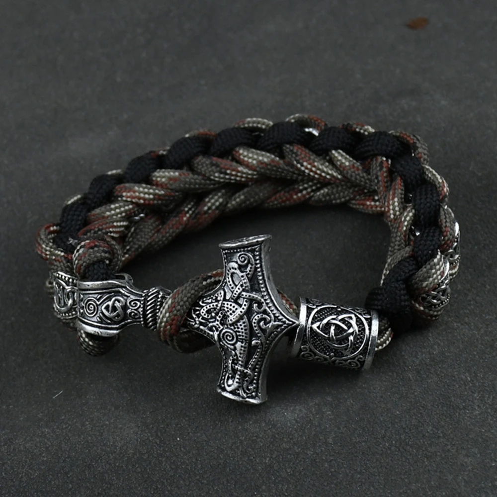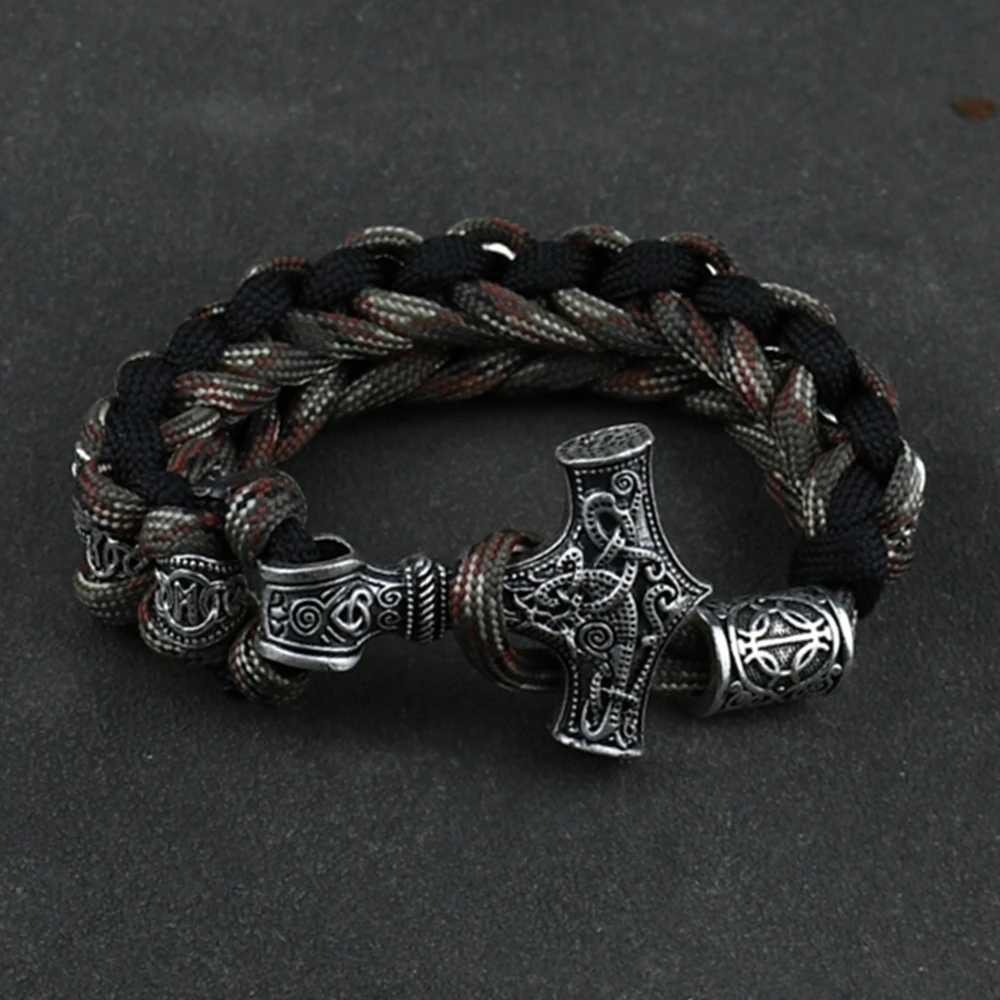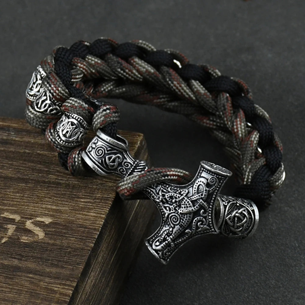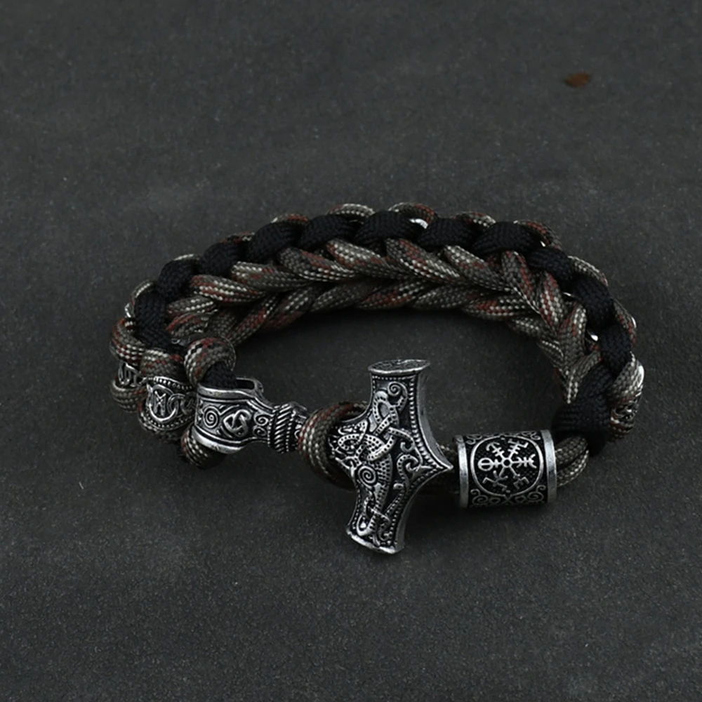 Thor Hammer Viking Bracelet with Runes and Vegvisir