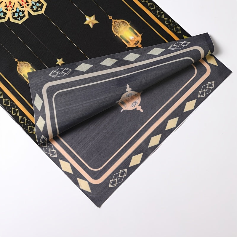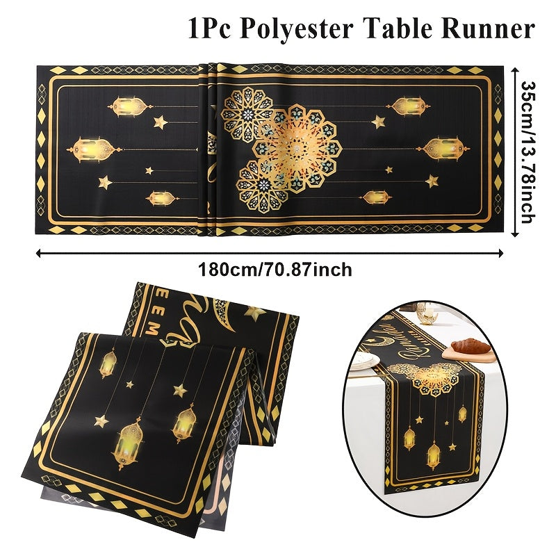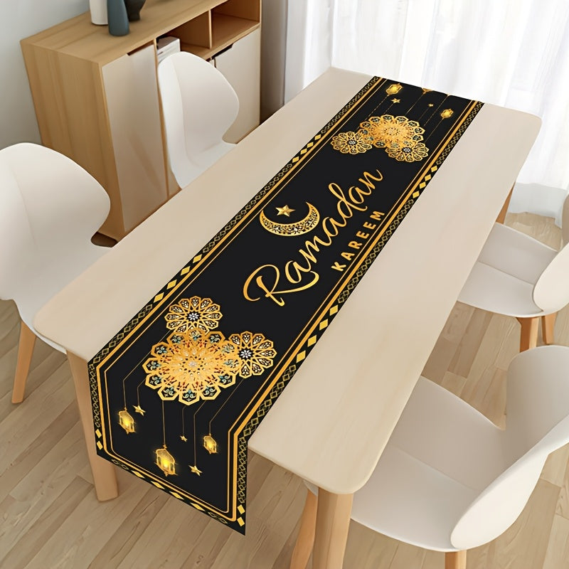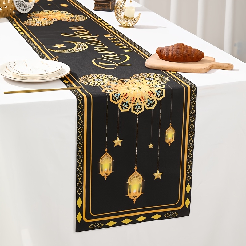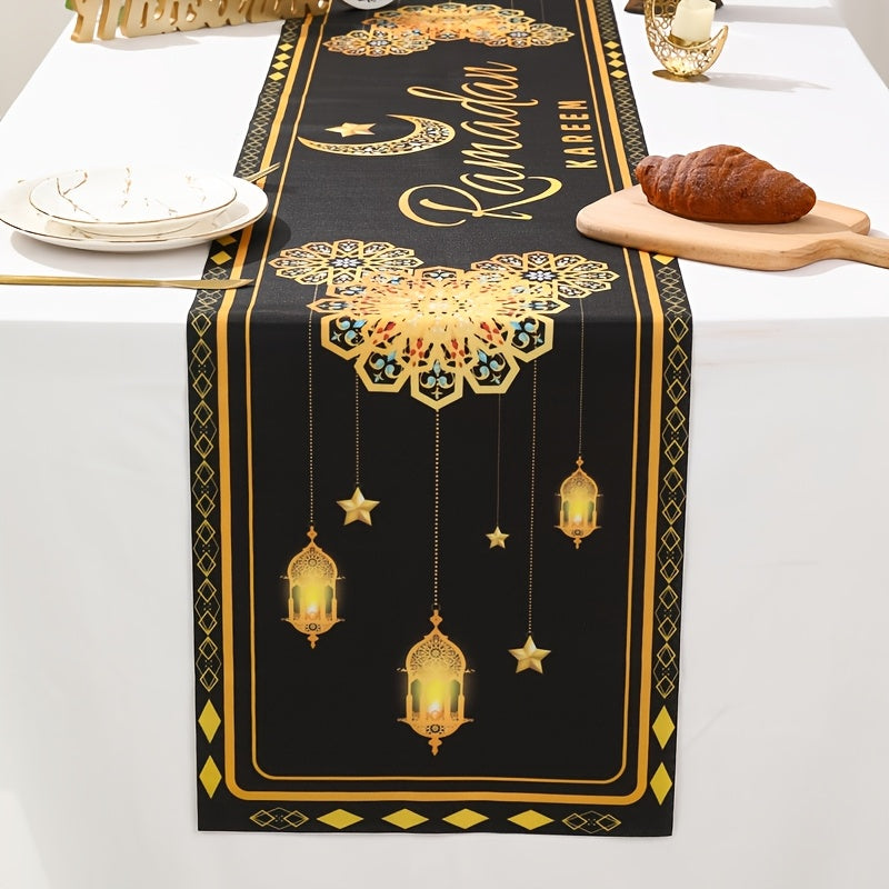 Elegant Ramadan Kareem Table Runner - 35.56cm x 177.8cm, Black & Golden with Moon, Stars, and Lanterns Design, Polyester, Perfect for Eid Al-Fitr & Islamic Celebrations