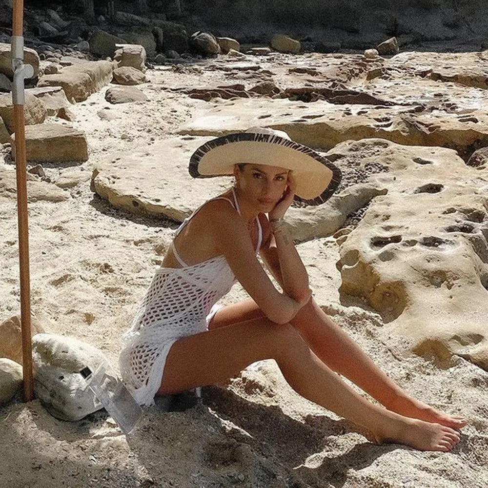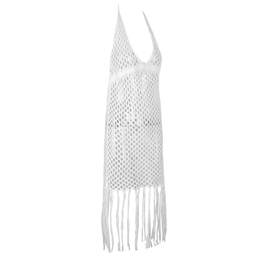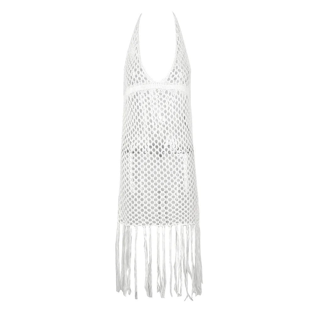 "2025 White Crochet Bikini Cover-Up, Sexy Hollow Out Tassel Mini Dress for Women"