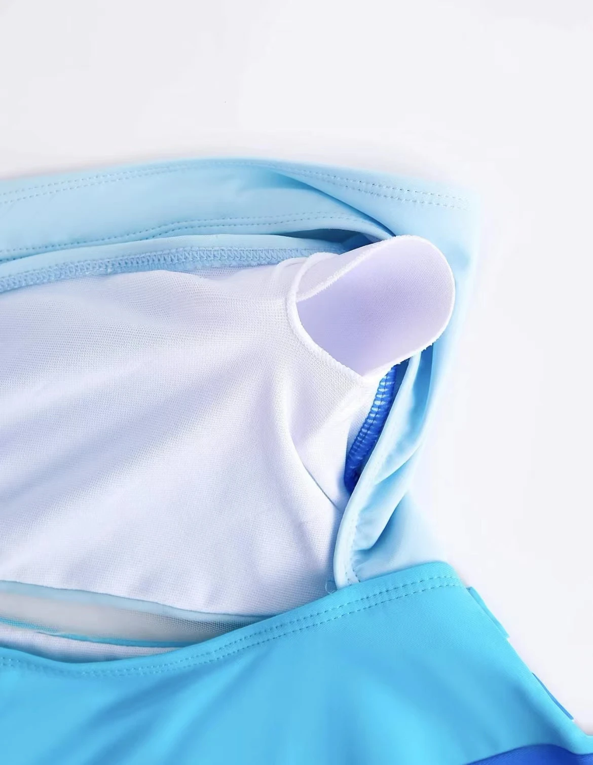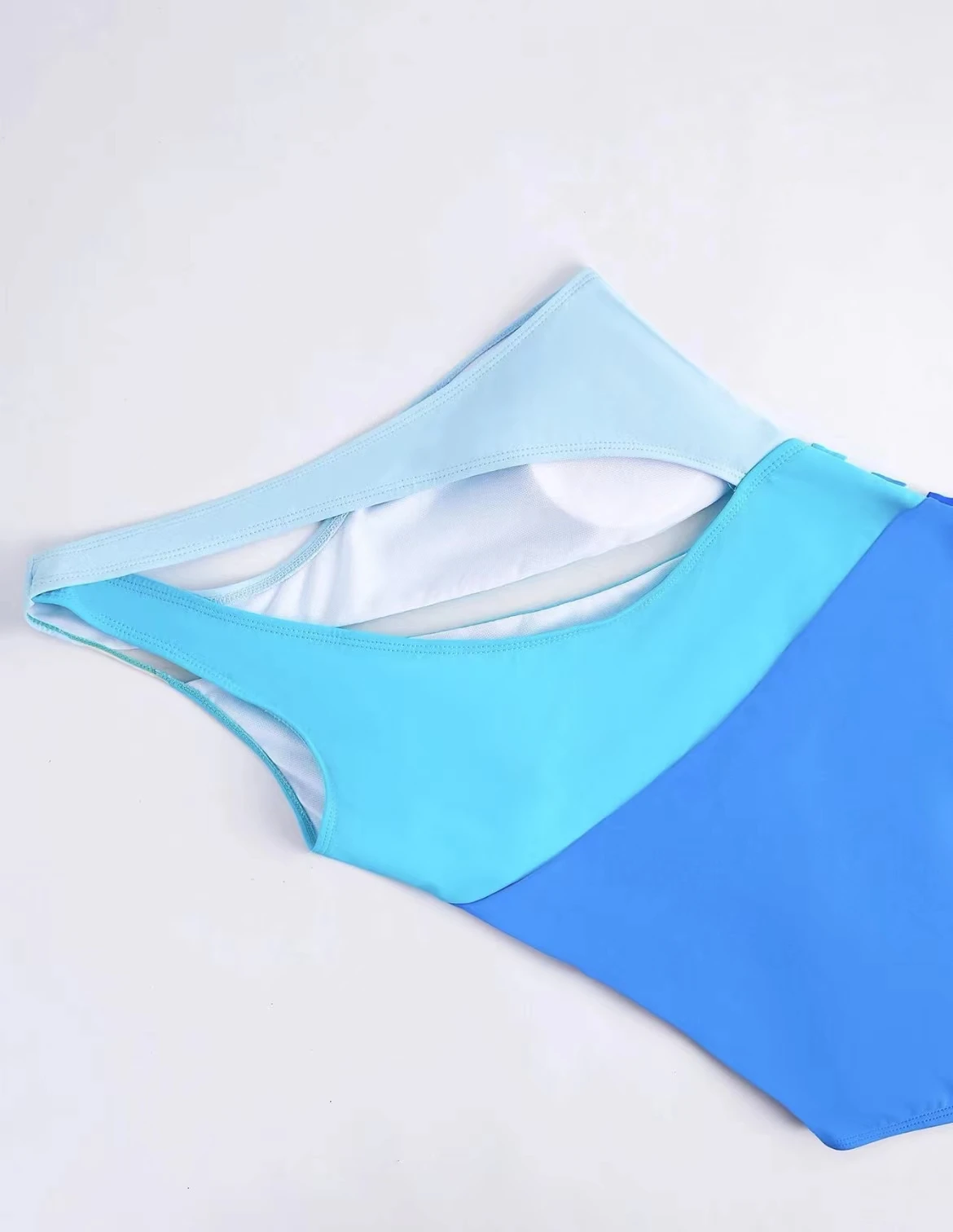 "Cikini One-Piece Swimwear for Women, Blue Panel, Contrast Color, Mesh Cutout Bathing Suit, Summer"