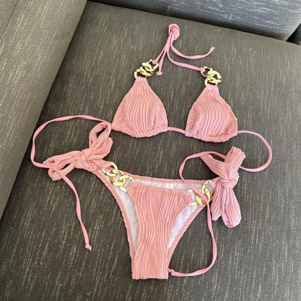 New Trendy Bikini Set for Women – Halter Lace-Up Ribbed Swimwear with Chain